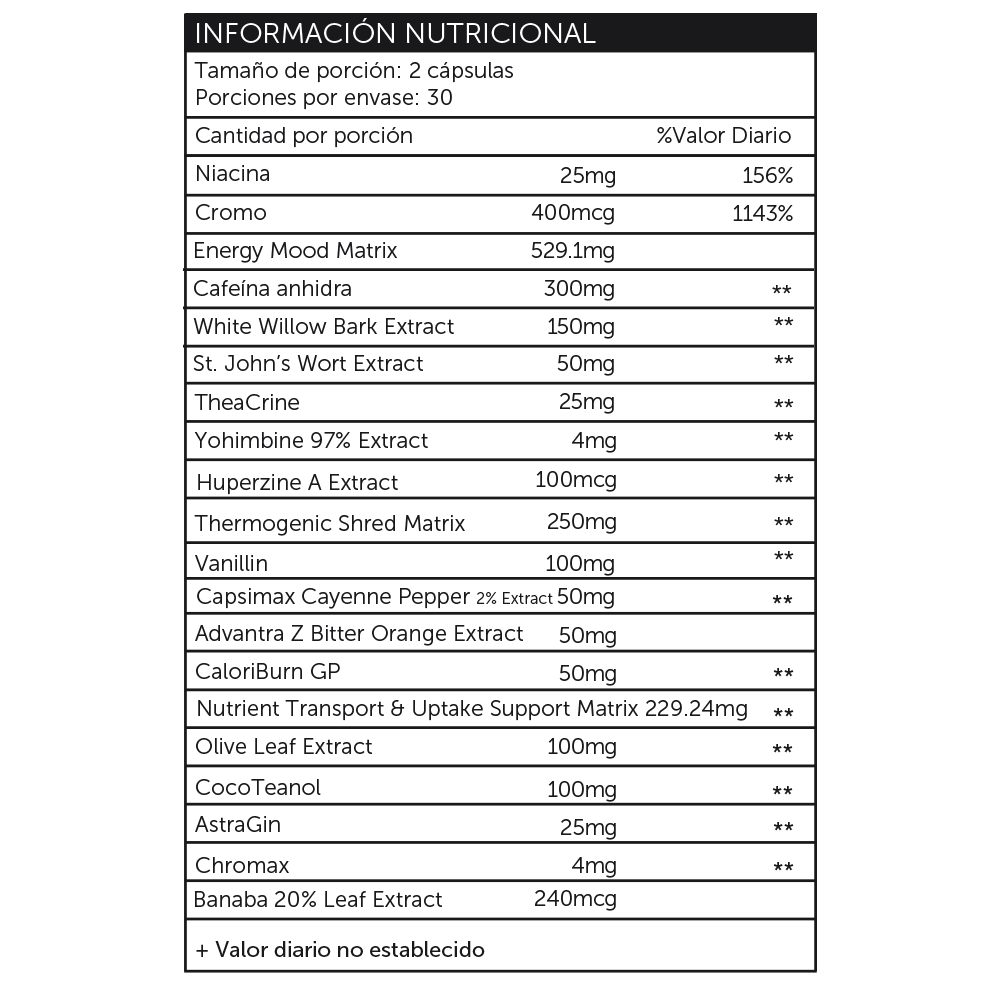 DNPX fue diseñado para ayudar en la aniquilación extrema de la grasa corporal y el apetito. Como no nos conformamos con la complacencia, tomamos la fórmula DNPX original y la llevamos a un nivel completamente nuevo. Formulado para ser el termogénico más poderoso y de mayor impacto en el mercado, DNPX contiene el equilibrio perfecto de ingredientes termogénicos y supresores del apetito con compuestos que mejoran el conocimiento para una máxima pérdida de grasa y claridad mental.