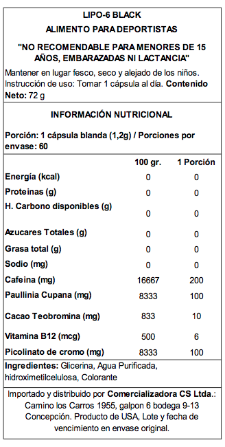 Si con tu actual controlador de peso has llegado a un límite y no puedes lograr mejores resultados, lipo-6 black es lo que estabas necesitando Formato: 60 capsulas ¿Como usar LIPO 6 BLACK ULTRA CONCENTRADO? Tomar una cápsula por la mañana 30 minutos antes del desayuno y una cápsula por la tarde. Esta es una fórmula ultra concentrada de extrema potencia. Nunca exceder una cápsula por servicio, nunca tomar más de dos servicios en un período de 24 horas. NO UTILIZAR EN CASO DE EMBARAZO O LA LACTANCIA.