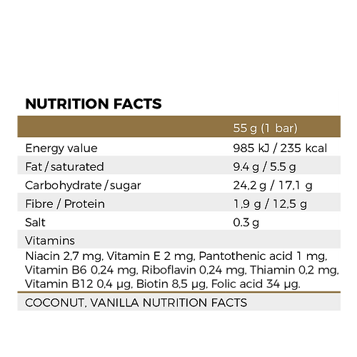 Esta barrita proteica de excelente sabor y equilibrada proporción de proteínas y vitaminas, suministra elcantidad necesaria de energía. Contiene 23 % de proteína yuna mezcla de nueve vitaminas, además, es una buena fuente de fibra.