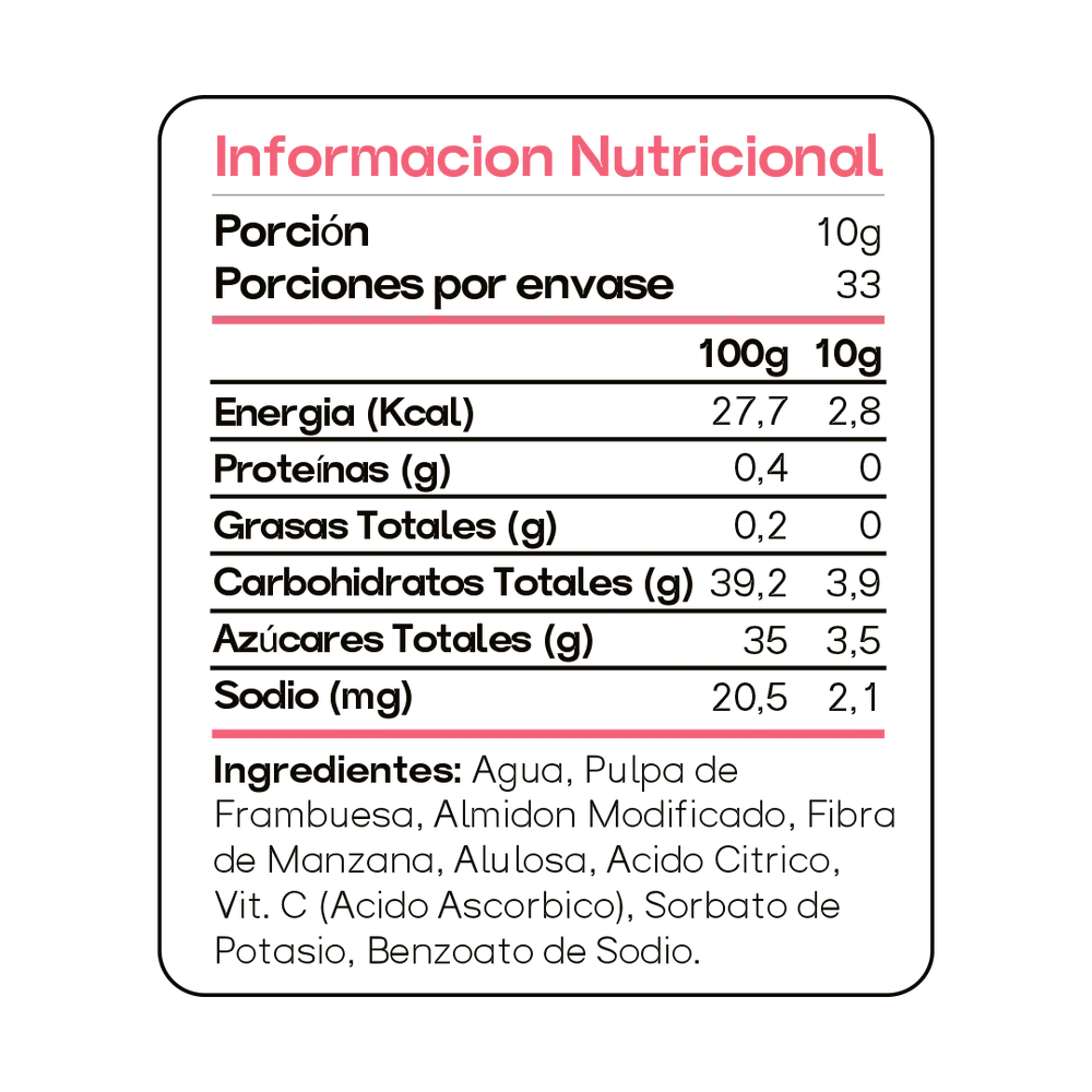 Ingredientes: agua, pulpa de frambuesa, almidón modificado, fibra de manzana, alulosa, ácido cítrico, vit. C (ácido ascorbico), sorbato de potasio, benzoato de sodio.