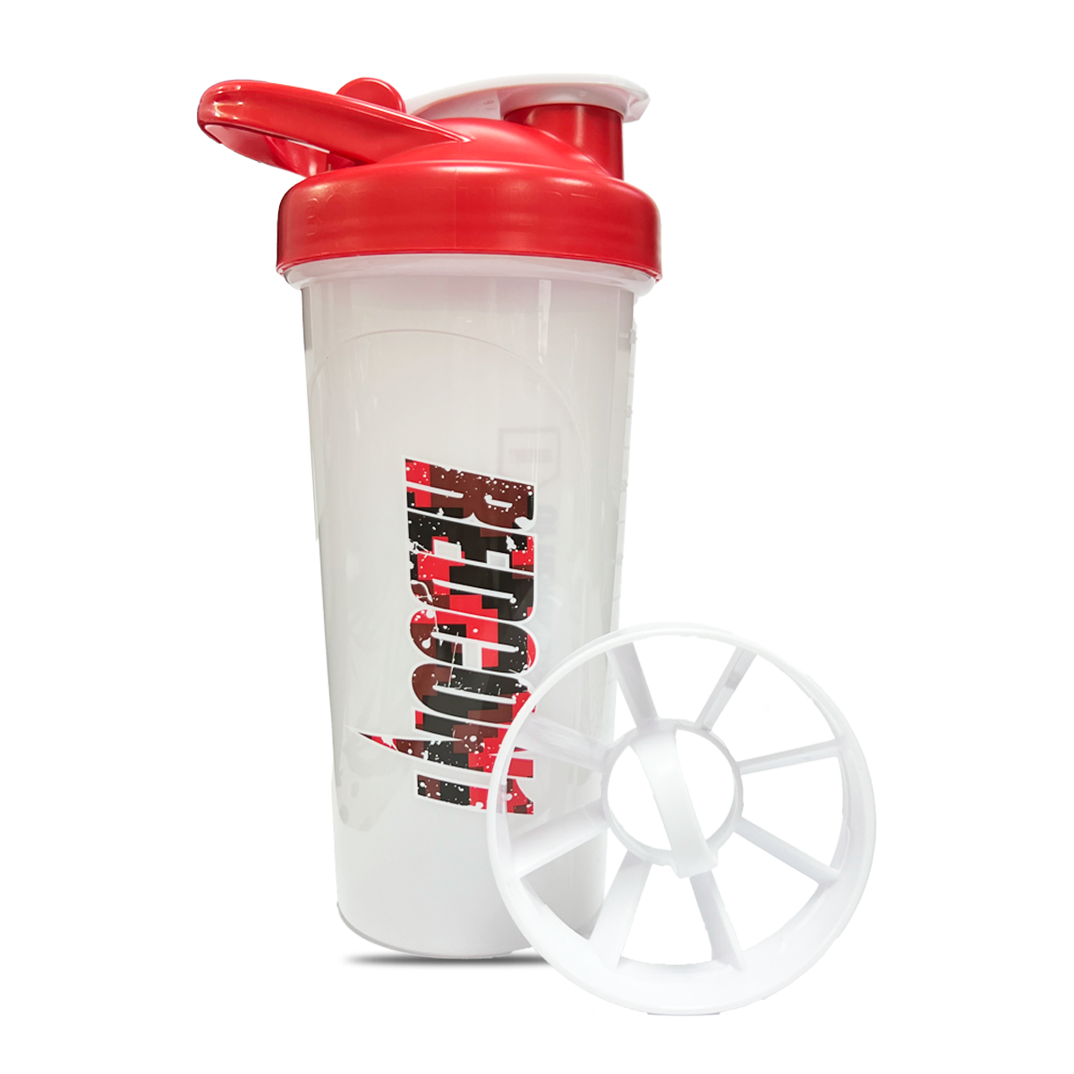 Shaker marca Redcon1 Libre de BPA Plástico ultra resistente Medidas en onzas y ml Capacidad 700 ml Mezclador tipo rejilla Color blanco con rojo