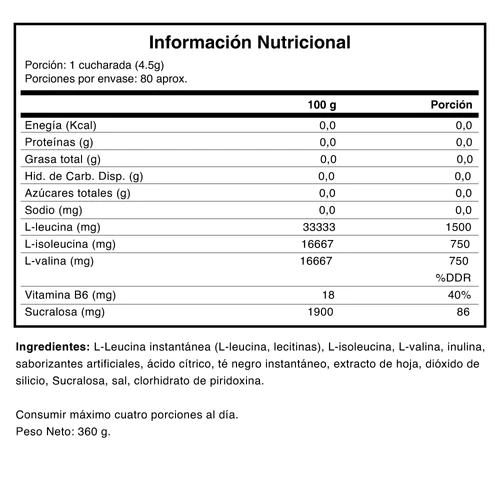 Bebida en polvo saborizada sin azúcar con edulcorantes y vitamina B6, que contiene 6000 mg de BCAA por ración.